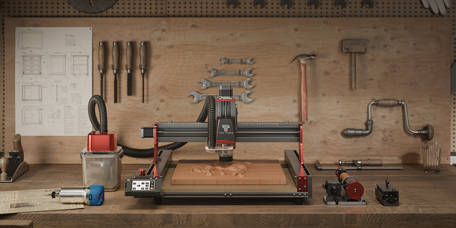 Twotrees TTC450 PRO CNC Router Machine + Vacuum Cleaner M1 + 4th Axis + End Mills